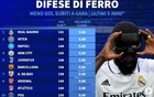 近5年五大联赛场均失球最少榜:皇马0.86球第1,国米0.88球第2